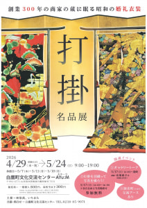 2026年4月12日 イベント開催のお知らせ 【昭和の打掛名品展】 日時:2026年4月29日~5月24日(休館日あり) 会場:山形県白鷹町文化交流センターAyu:M 観覧料:一般個人800円、高校生以下300円 詳細はこちらから