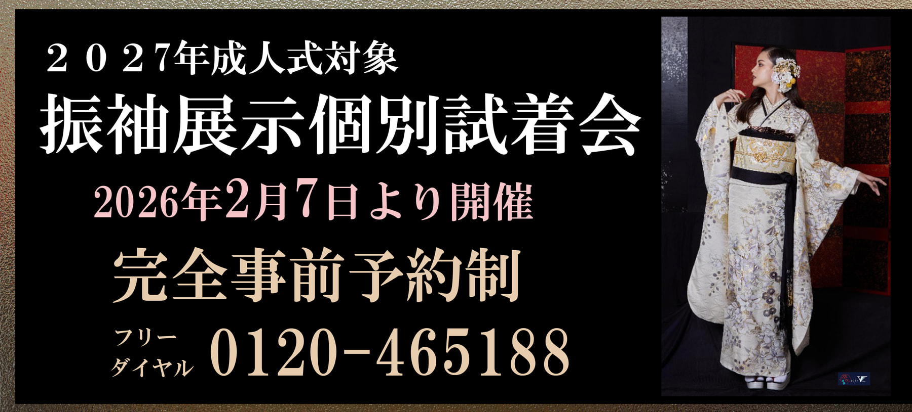 2027年(令和9年)成人式対象の振袖展示個別試着会を上記の期間開催いたします。